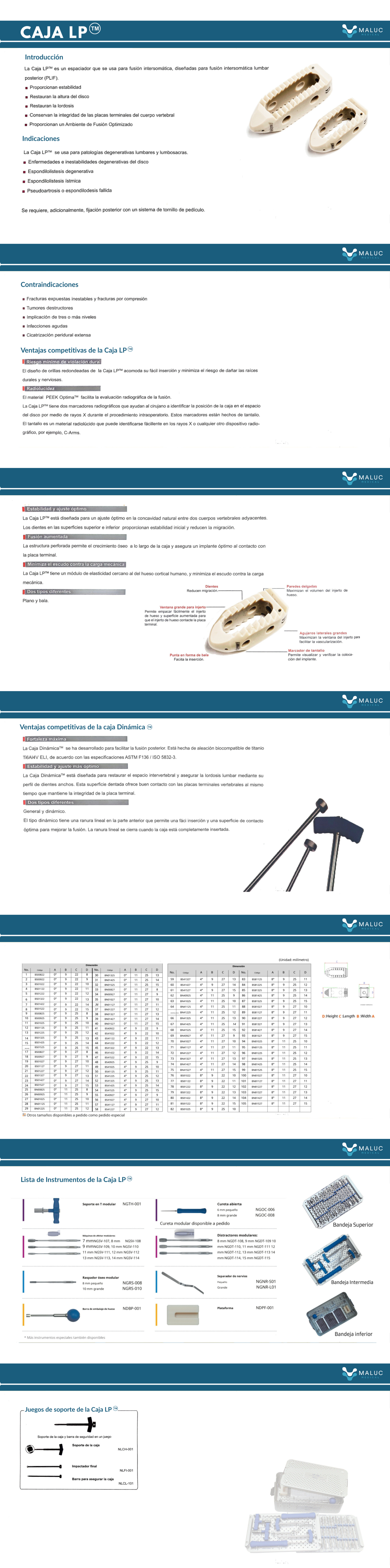• Cajas PLIF PEEK (Caja LP™):Material: PEEK Optima™ con marcadores de tantalio.Tipos/Formas: Disponibles en diseño Plano y con punta tipo Bala para facilitar la inserción.Lordosis (Ángulos): Se ofrecen en múltiples ángulos para restaurar la curvatura natural, incluyendo 0°, 4° y 8°.Dimensiones: Una extensa gama de tamaños para adaptarse a la anatomía del paciente, con combinaciones de:Anchos: 9 mm y 11 mm.Longitudes: 22 mm, 25 mm y 27 mm.Alturas: Desde 8 mm hasta 15 mm.