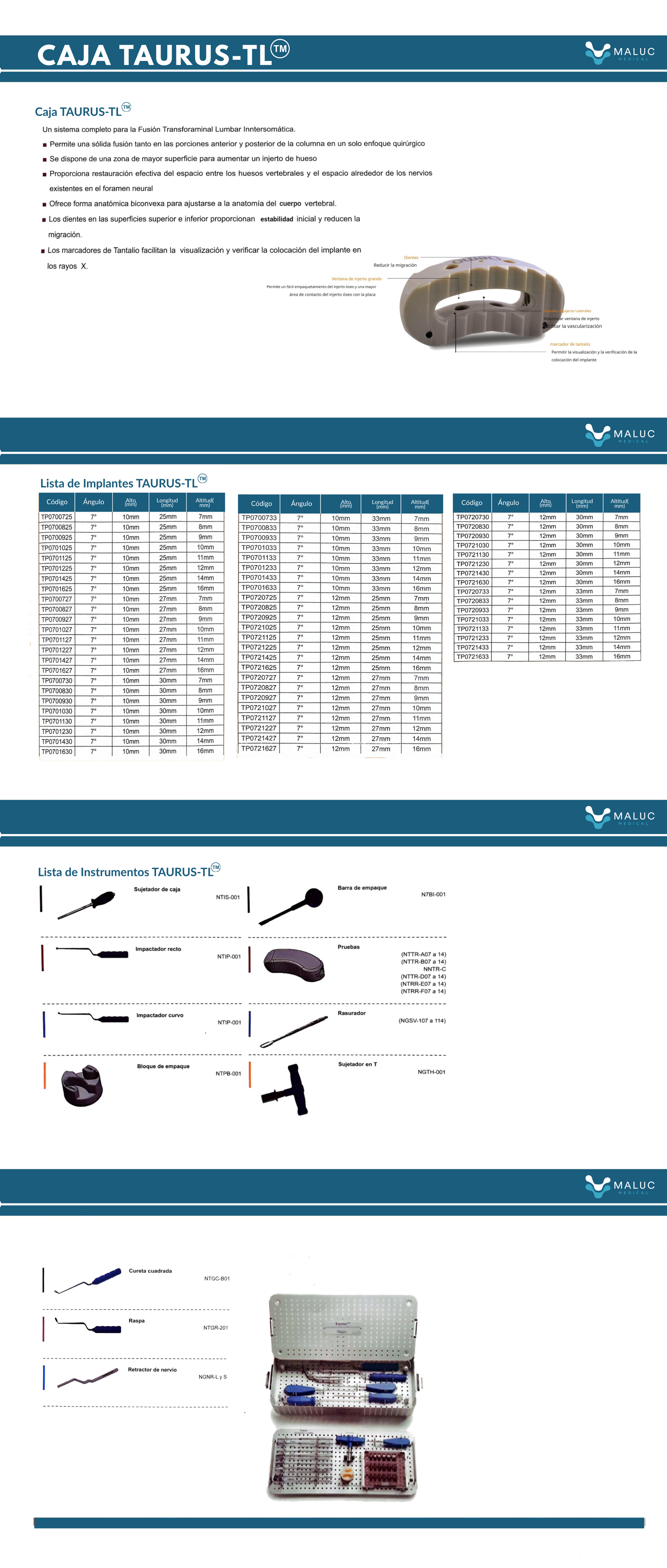 El sistema CAJA TAURUS-TL™ es una solución completa diseñada para la Fusión Lumbar Intersomática Transforaminal (TLIF). Permite lograr una sólida fusión de las porciones anterior y posterior de la columna a través de un único abordaje quirúrgico. Su diseño anatómico biconvexo se ajusta a la forma del cuerpo vertebral y ofrece una amplia superficie para maximizar el volumen del injerto óseo. El implante contribuye a la restauración efectiva del espacio intervertebral y foraminal. La estabilidad inicial está asegurada por dientes en las superficies superior e inferior que reducen la migración. Adicionalmente, cuenta con marcadores de Tantalio que facilitan la correcta visualización y verificación de la colocación del implante mediante rayos X durante el procedimiento.