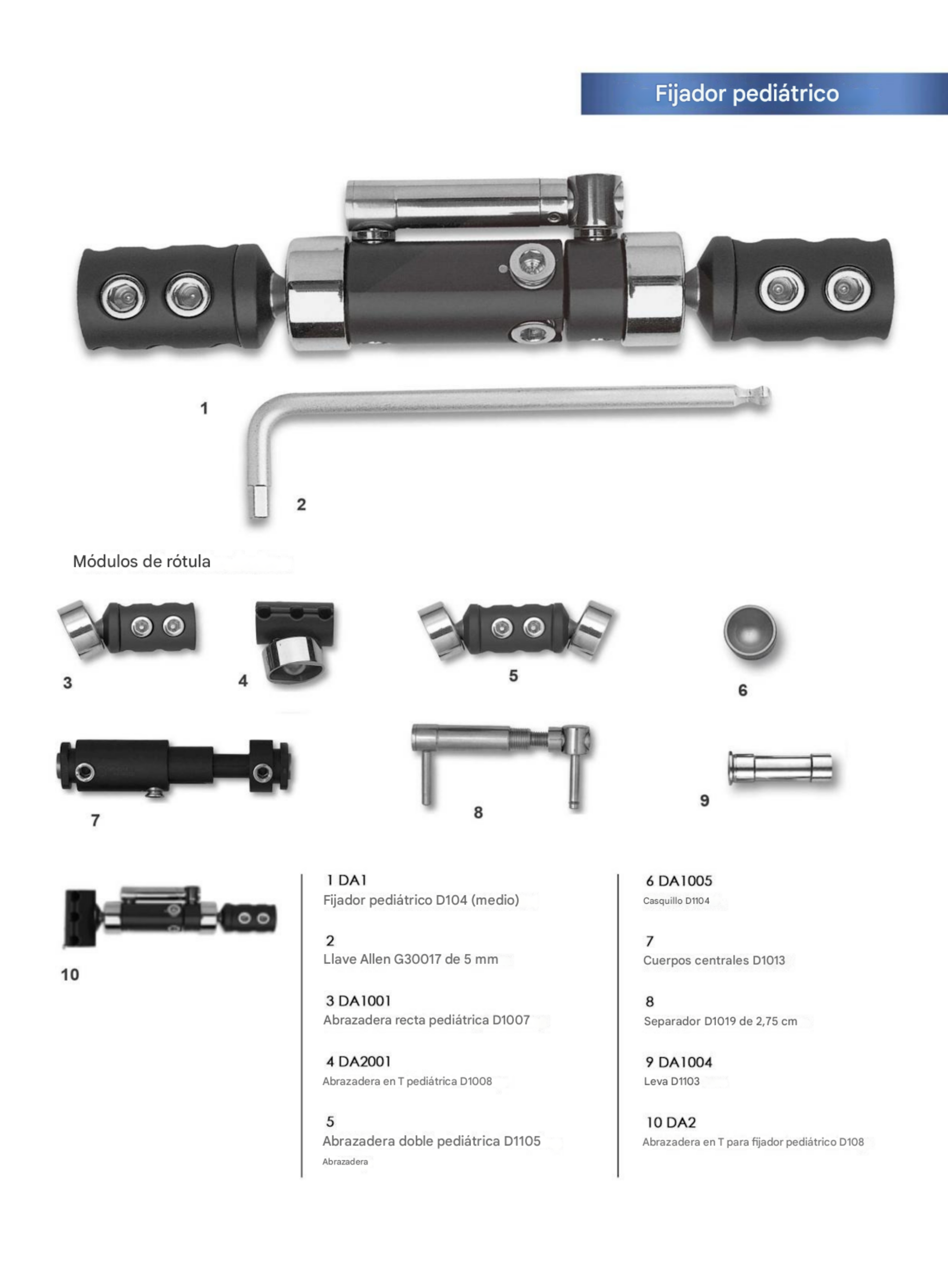 - Sistema Completo: Incluye fijadores, módulos de rótula, abrazaderas y distractores adaptados para uso pediátrico.