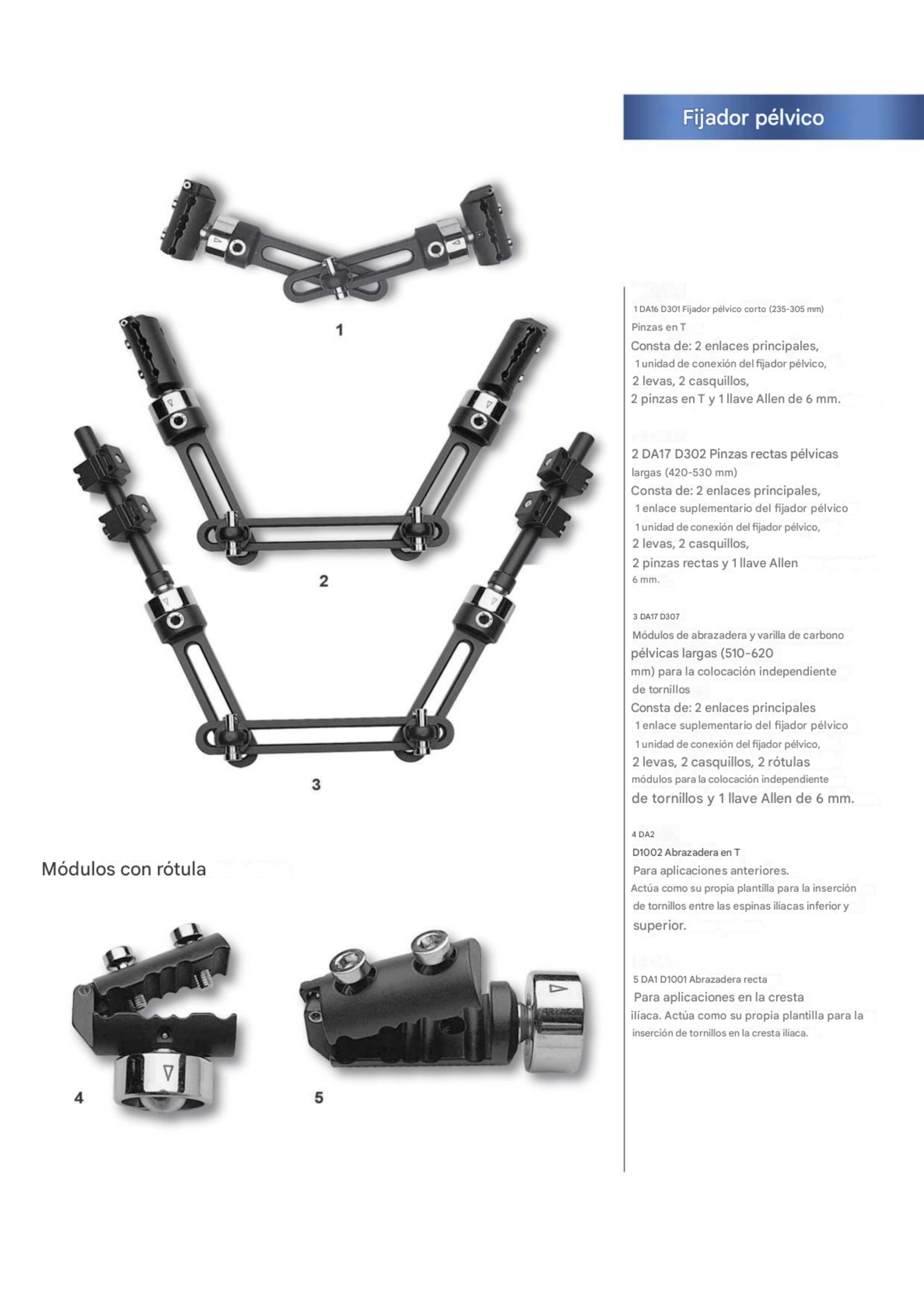 - Colocación Versátil de Clavos: Permite la inserción de clavos en la cresta ilíaca o entre las espinas ilíacas, con abrazaderas en T y rectas.
