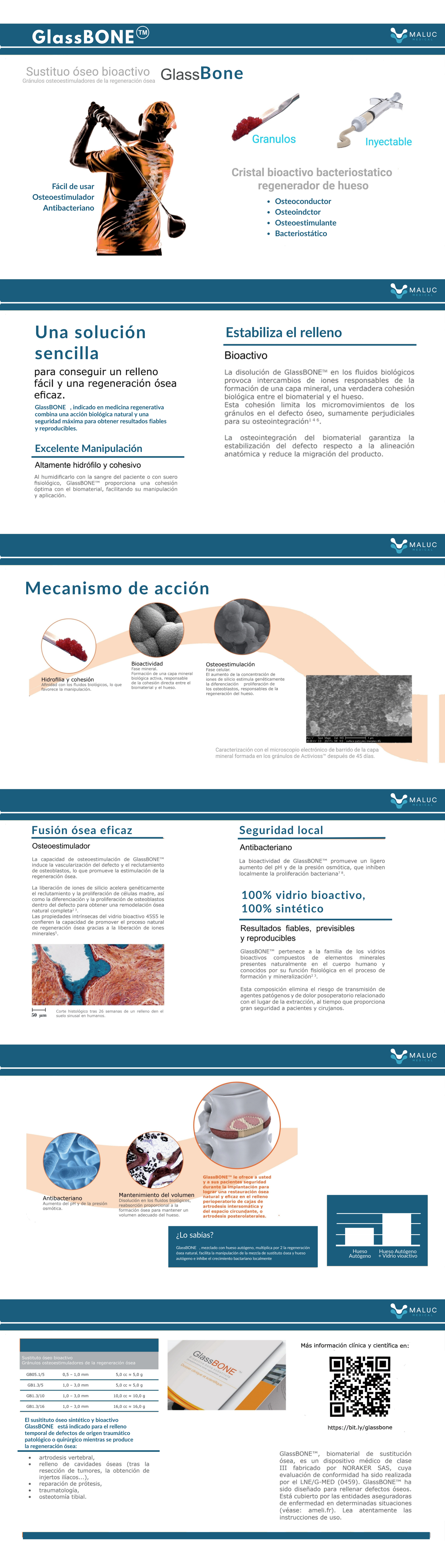 GlassBONE™ es un sustituto óseo bioactivo y 100% sintético, compuesto por gránulos de vidrio bioactivo diseñados para estimular la regeneración ósea. Su mecanismo de acción se basa en sus propiedades osteoconductoras, osteoestimulantes e incluso osteoinductoras. Al entrar en contacto con fluidos biológicos, forma una capa mineral que crea una cohesión directa con el hueso, estabilizando el relleno. La liberación de iones de silicio estimula genéticamente la proliferación de osteoblastos, acelerando la formación de hueso nuevo. Además, su bioactividad promueve un ligero aumento del pH local, lo que le confiere propiedades bacteriostáticas, aumentando la seguridad. Su composición sintética elimina el riesgo de transmisión de patógenos. Es un material altamente hidrófilo y cohesivo al mezclarse, lo que facilita enormemente su manipulación y aplicación en el defecto óseo.