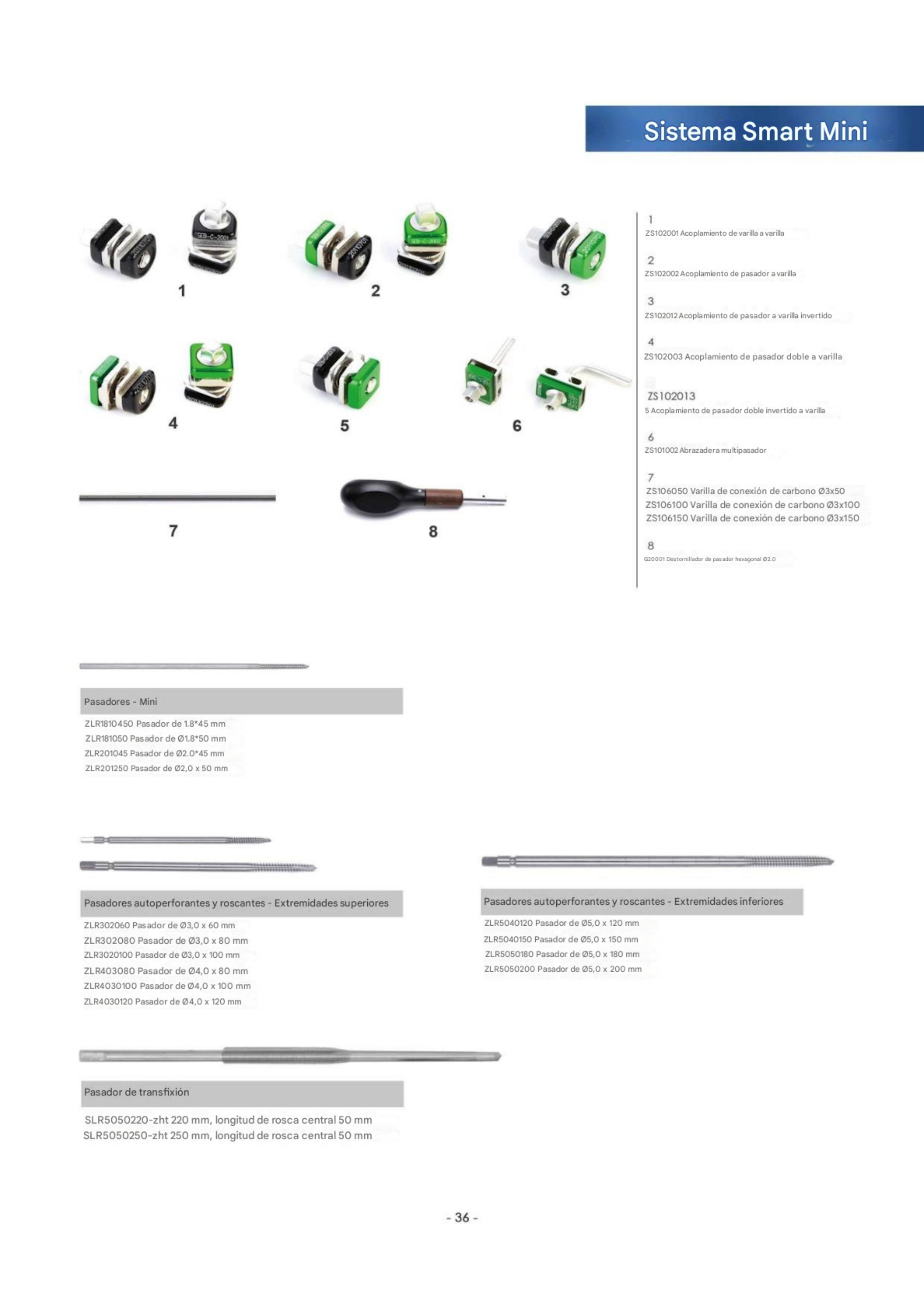 - Varillas de Carbono: Utiliza varillas de conexión de carbono de Ø3mm para una fijación ligera y radiolúcida.